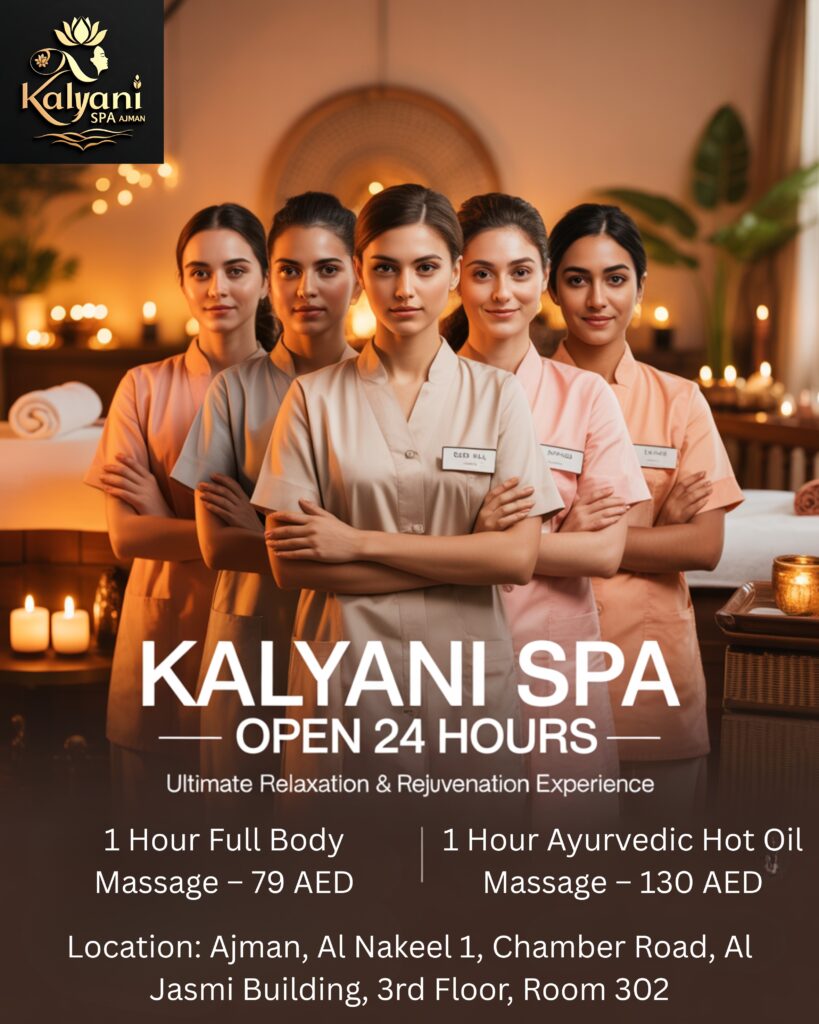24 HOURS MONDAY TO SUNDAY 12 AM to12 PM Available Therapist Are FromKerala TamilNorth India Morrocco Pakistan Srilanka Mail:ajman@kalyanispa.com CONTACT +971 588493943